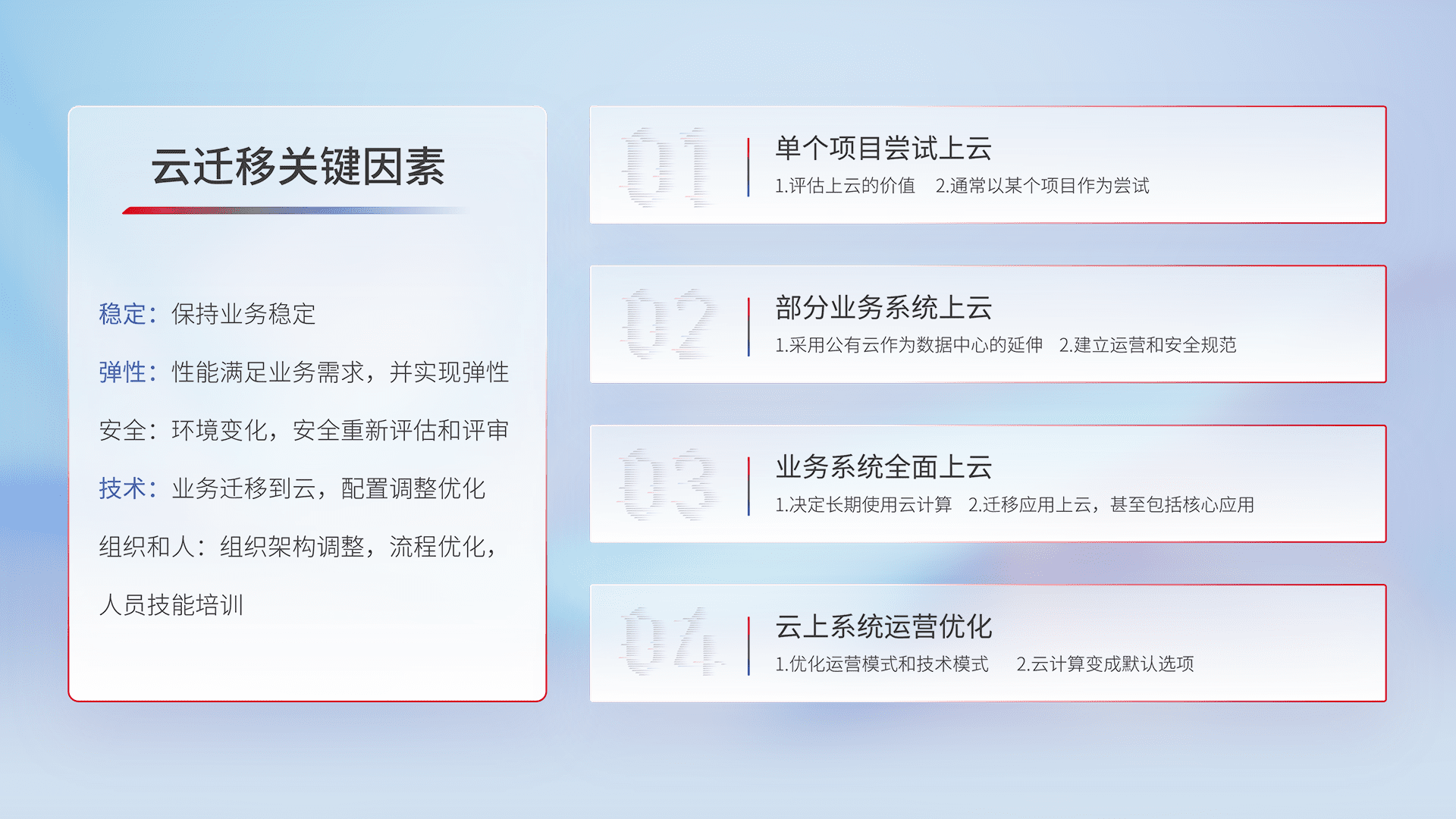 结合实际业务,,,从规划设计、、、、云平台选型、、云原生改造、、数据迁移、、、、集成交付,,,,迁移全过程为客户识别最佳上云路径,,,,做好风险识别管理,,,,设计网络架构、、、、身份权限、、、安全审计合规、、操作审计、、、、日志审计、、、监控告警策略、、、、多站点容灾设计等,,,,对云上基础设施进行整体规划,,提升IT治理水平,,,以满足弹性、、、高可用、、、高性能的需求。。。。